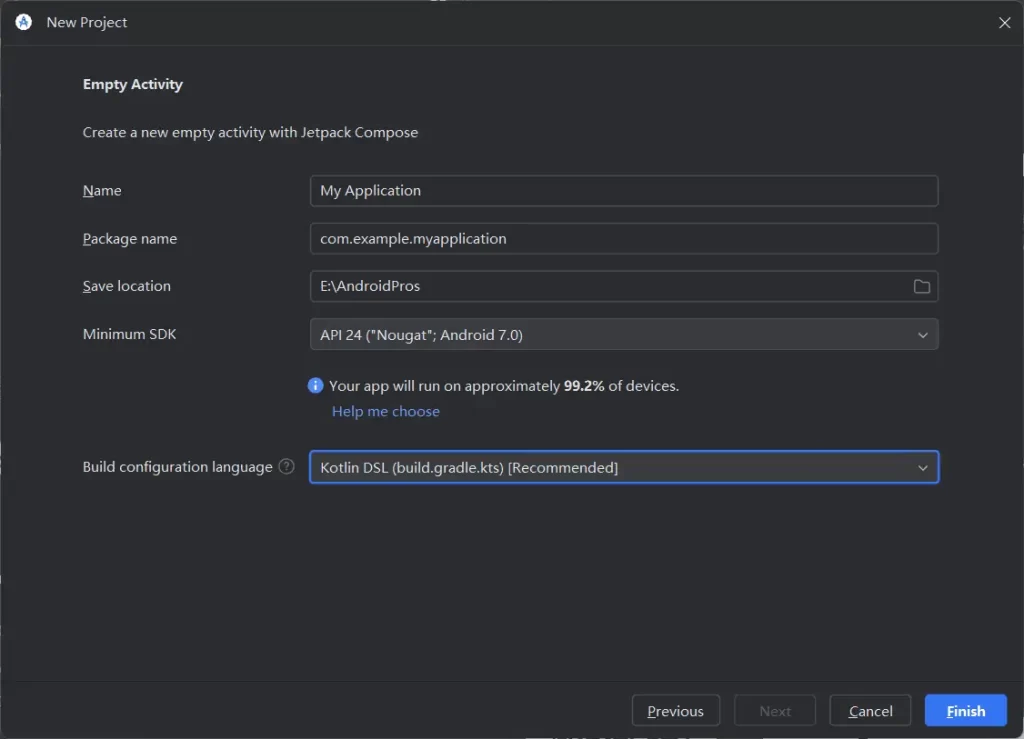 然后这里可以更改项目名称、存放路径、以及包名等等,幽络源这里只修改了存放路径其他都是默认,然后点击Finish完成创建