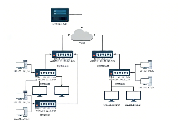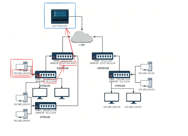 - 每一个家用路由器,其实又作为运营商路由器的子网中的一个节点.这样的运营商路由器可能会有很多级,最外层的运营商路由器,WAN口IP就是一个公网IP了