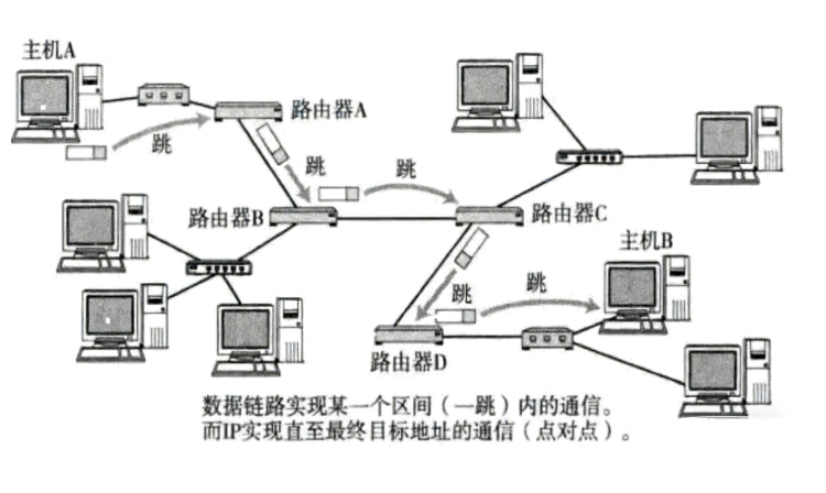 所谓"一跳"就是数据链路层中的一个区间.具体在以太网中指从源MAC地址到目的MAC地址之间的帧传输区间.