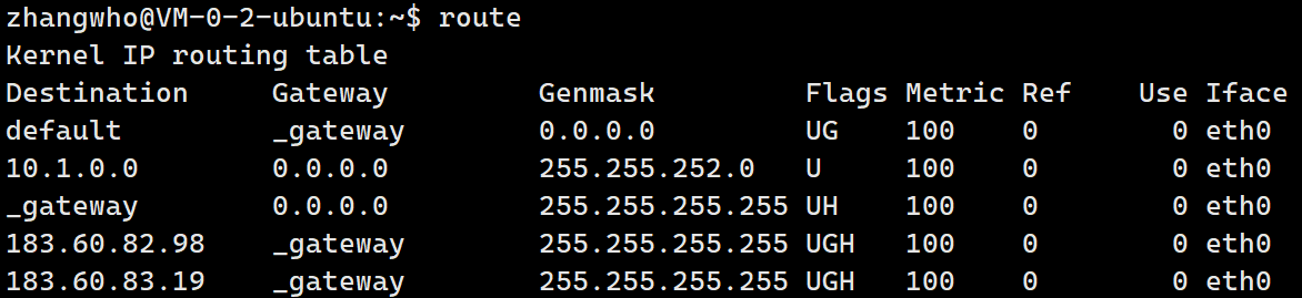- Flags:路由标志(如U=可用、G=需网关、H=目标是主机)
