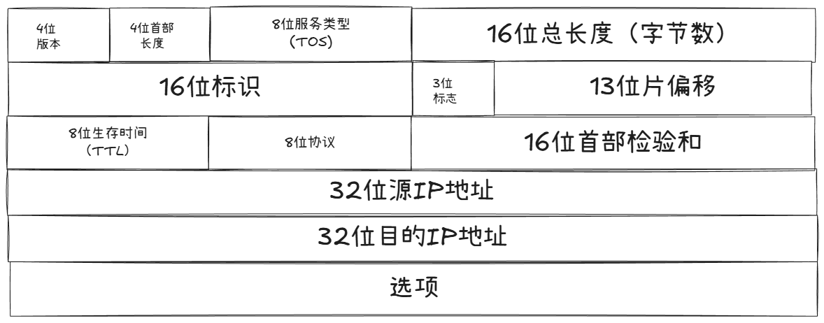 和TCP报头一样,记录报头大小的,基本单位是4字节。报头除掉选项部分就是基本报头,基础大小是20字节,填在4位首部长度就是0b101.最大能填0b1111,即60字节,因此选项最多40字节。