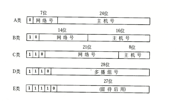 过去曾经提出一种划分网络号和主机号的方案,把所有IP地址分为五类,如下图所示