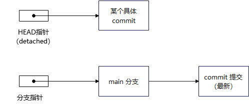 此时 HEAD 不再指向任何本地分支,而是直接指向某个具体的 commit 提交,就像下面这样,HEAD 指针脱离了本地分支指针,直接指向 commit