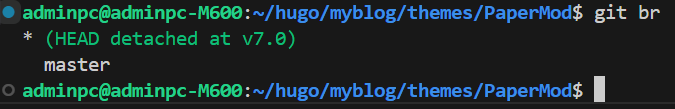 由于之前 git checkout 到了 v7.0 旧版本,可以看到此时 PaperMod 的工作区进入了 detached Head 分离头指针状态