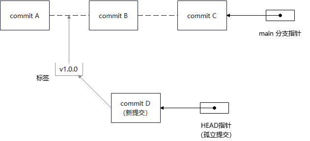 这个时候,这个新的孤立提交就很容易丢失,一旦切换到其他分支,这个新的孤立提交 commit D 就悬空了,因为没有本地分支指向它,Git 的垃圾回收未来可能就永久地删除这个提交,所以不要在 Detached HEAD 状态下做任何提交
