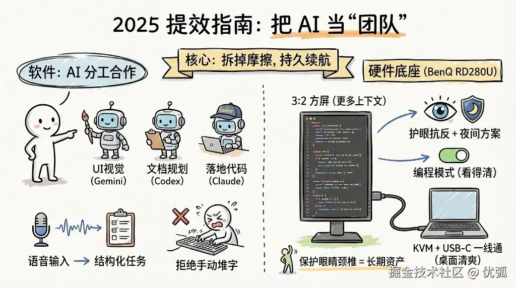 所以这篇我就按"软件工作流 → 硬件底盘"的顺序来讲:软件上怎么把AI当团队把活交付出来,硬件上 RD280U 怎么把多窗口和长时间盯屏这两件事稳住------最后你会发现,提效变顺很多时候不是更用力,而是摩擦更少。