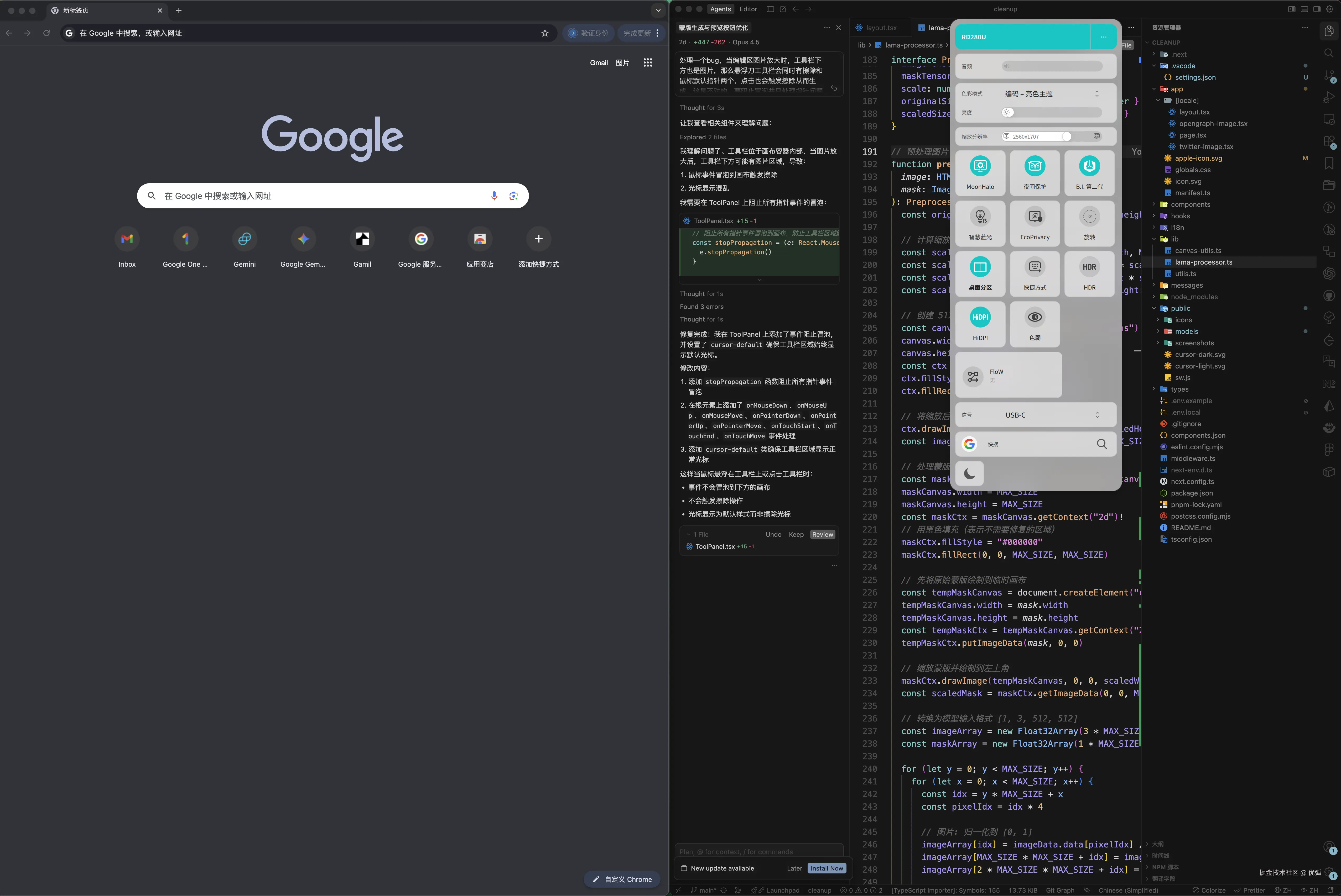 RD280U 是 28.2英寸,3840×2560,3:2。 单看参数不刺激,但实际写代码的时候非常直观:同一屏能看到更多代码行,尤其适合"左中右三栏 + 底部终端"的AI编程布局。