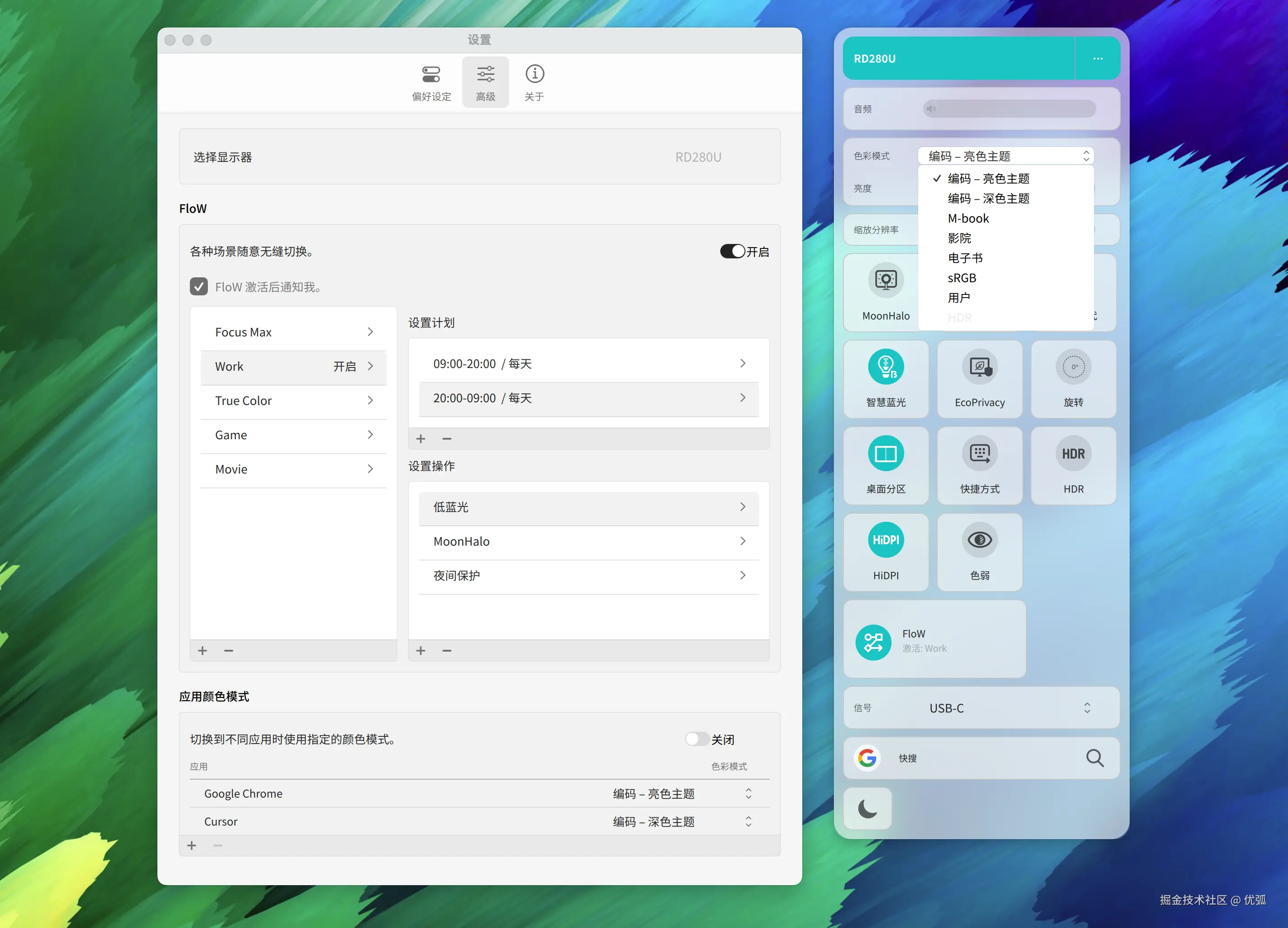 同时你还可以装 Display Pilot 2,在系统里点一下就切,甚至可以按时间自动切(白天浅色、晚上深色)。