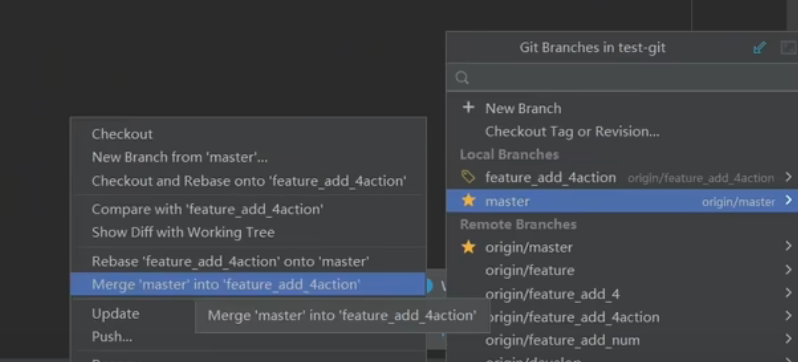接着再将master合并merge到feature分支,也变成新的,然后写你的代码。