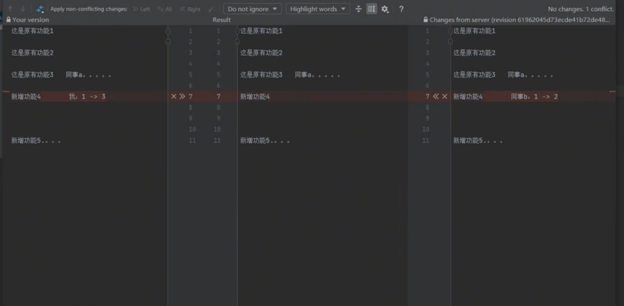 如果你和同事要改的代码发生了冲突就是都要在同一个地方修改代码,你commit代码后就选择跟着弹窗选择Merge然后会有3个小窗口界面,那就要手动去解决冲突跟同事沟通一下,修改中间那个窗口来决定最终保留的代码。