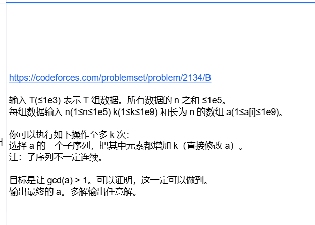 相加固定值后不互质,也就是都变成某一个数字的倍数,一个显然的东西是可以都变成偶数,但 k k k是偶数时加 k k k不会改变奇偶性,这不对。考虑都变成 k k k的倍数呢?加 k k k无法改变 m o d k \mod k modk的结果,无意义。