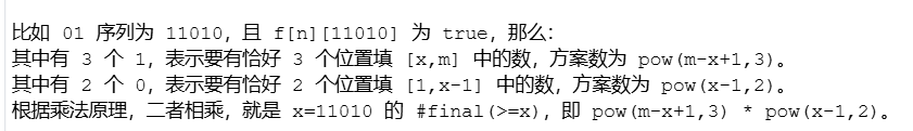 那么我们可以枚举 x x x,然后把元素划分成是否小于 x x x的两类,这两类仍然看可以套用我们前一问的 d p dp dp框架,求出所有 m a s k mask mask的方案数,然后如图,对于每个 m a s k mask mask,它实际对应了多种方案,因为我们是让 0 0 0表示小于 x x x, 1 1 1表示大于等于 x x x,前者可以取 [ 1 , x − 1 ] [1,x-1] [1,x−1],后者可以取 [ x , m ] [x,m] [x,m],