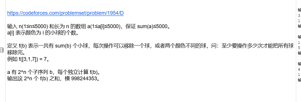我们前面分析的很清楚了,配对贪心根据元素最大出现次数是否超过一半,贡献就两种,所以考虑贡献法,我们要是可以算出来,考虑前 i i i种元素,最大出现次数,超过/不超过总数一半的方案数,乘上贡献值,累加就行。