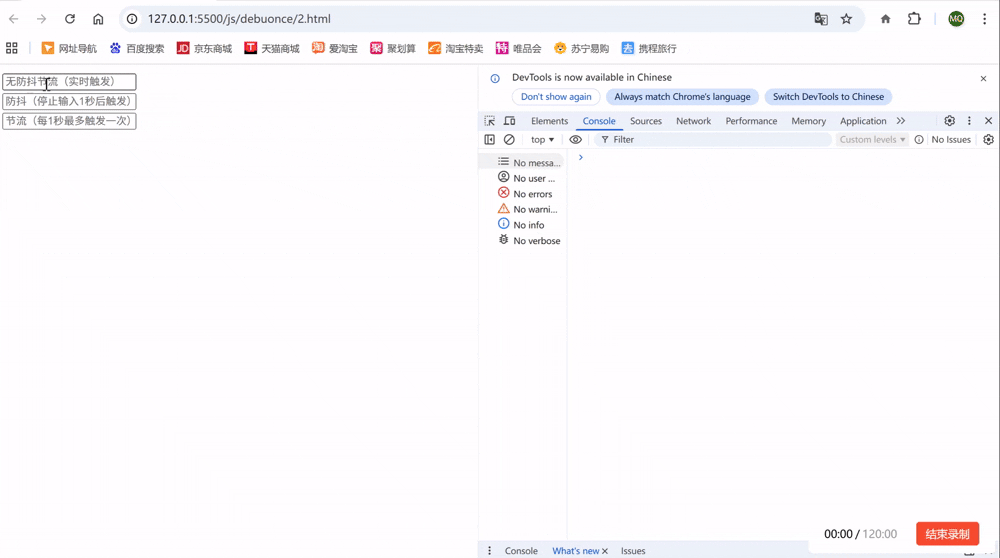 <input type="text" id="undebounce" placeholder="无防抖节流(实时触发)" />