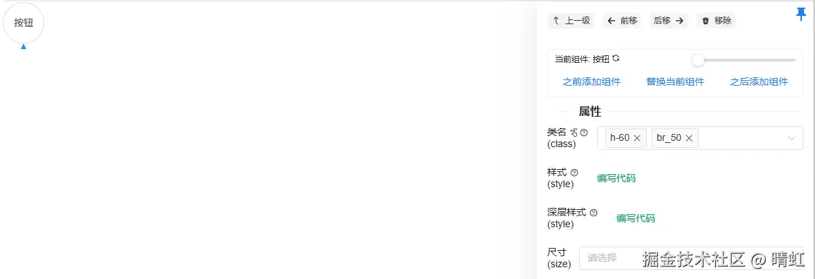 - 上一级 如果组件形成了嵌套关系,那么可以通过该按钮快速选择上一级,一直到当前的根元素,也就是行组件为止。