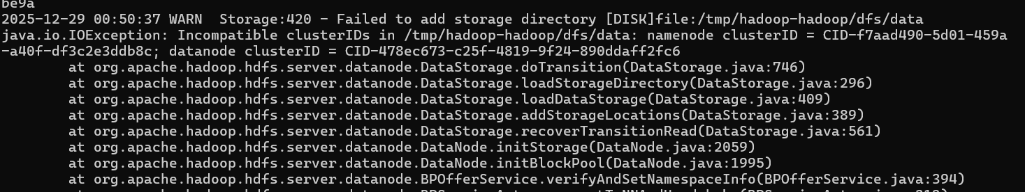 这意味着Datanode之前已经格式化并生成了一个集群ID,而Namenode有另一个集群ID。在Hadoop中,Datanode必须与Namenode具有相同的集群ID才能加入集群。