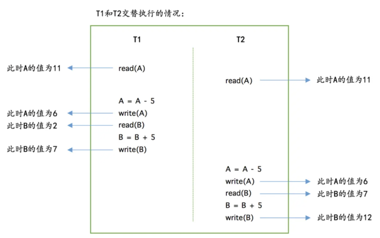 但是在数据库中,T1和T2的操作可能会交替执行: