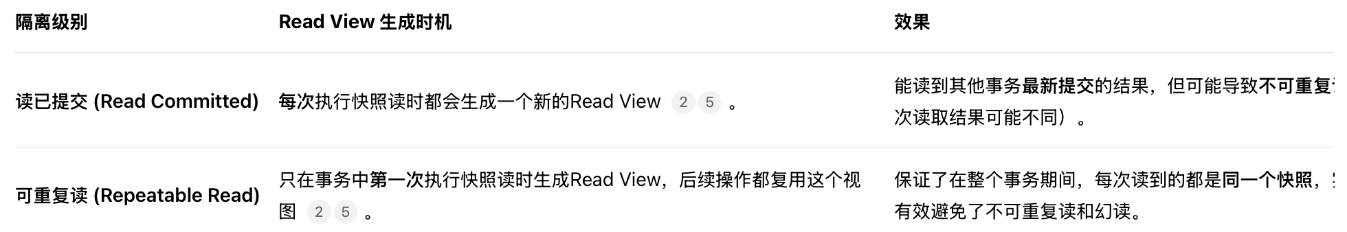 现代数据库(如 MySQL 的 InnoDB 引擎)主要通过 多版本并发控制(MVCC) 机制来实现读已提交隔离级别。其核心在于 Read View(读视图或一致性视图)的生成时机 。在读已提交隔离级别下,事务在执行每一条 SELECT语句时,都会立即生成一个新的 Read View 。这个 Read View 可以理解为数据库在当前这个瞬间 的一个"快照",它记录了此刻所有已提交事务的状态。通过这个快照,系统可以判断数据行的哪个版本对当前事务是可见的。