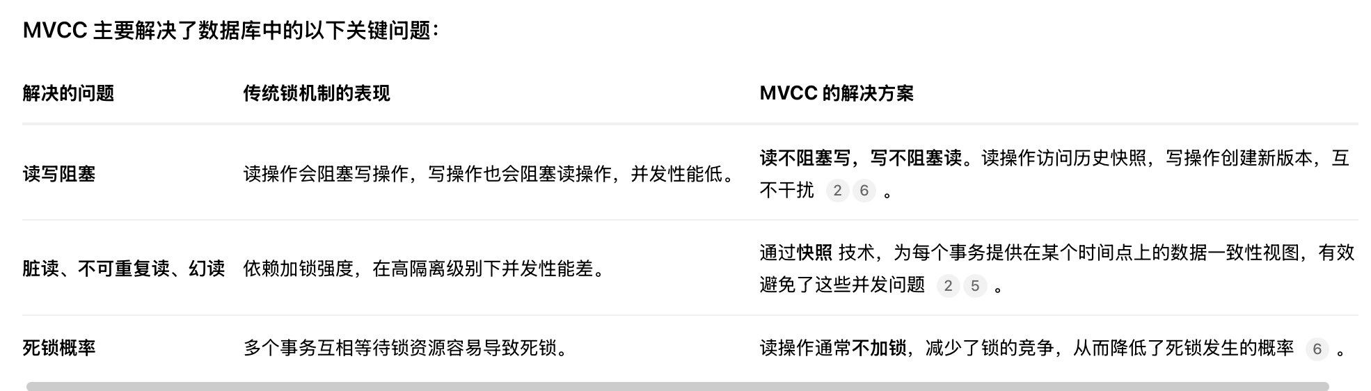SELECT)不会阻塞写操作,写操作也不会阻塞读操作。Undo Log 保存了数据行的历史版本,当某个事务需要读取一行数据时,如果这行数据正在被其他事务修改或该版本对当前事务不可见,InnoDB 就会通过回滚指针在 Undo Log 链表中寻找符合当前事务可见性的历史版本数据(快照读),从而避免了加锁等待。