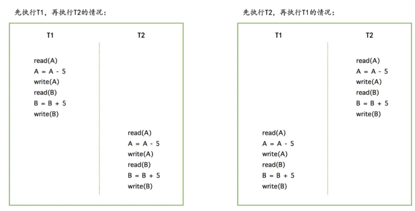 假设a向b同时进行两次转账操作(在两台ATM机上同时进行),分别设这两次转账操作为T1、T2,理论上在现实世界中这两个操作是没有关系的,应该是先执行T1再执行T2,或者先T2后T1: