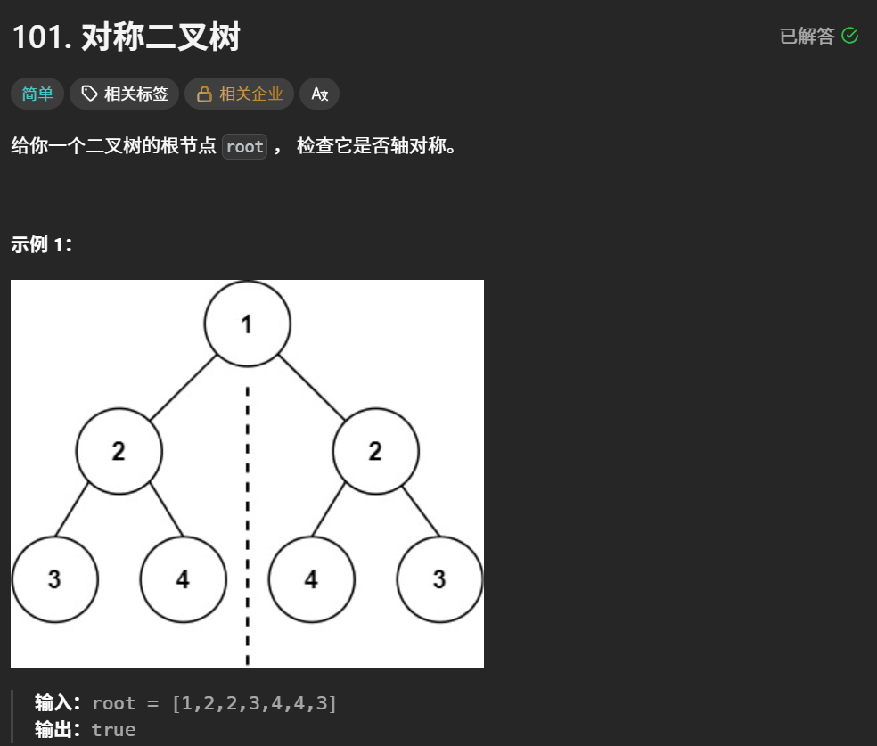 - 如果左右都对称就返回true ,有一侧不对称就返回false 。