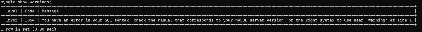 Query OK, 1 row affected, 1 warning (0.01 sec) # 这里有一个警告信息