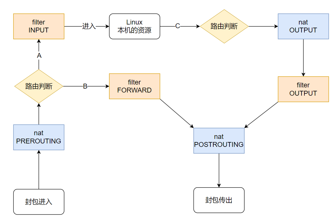 Linux本机的资源(如本机的 Web 服务、数据库)。 - 路径 B(需要转发) :进入 filter 表的 FORWARD 链,过滤 "流经本机转发" 的数据包(比如本机作为路由器时,转发内网到外网的流量)。