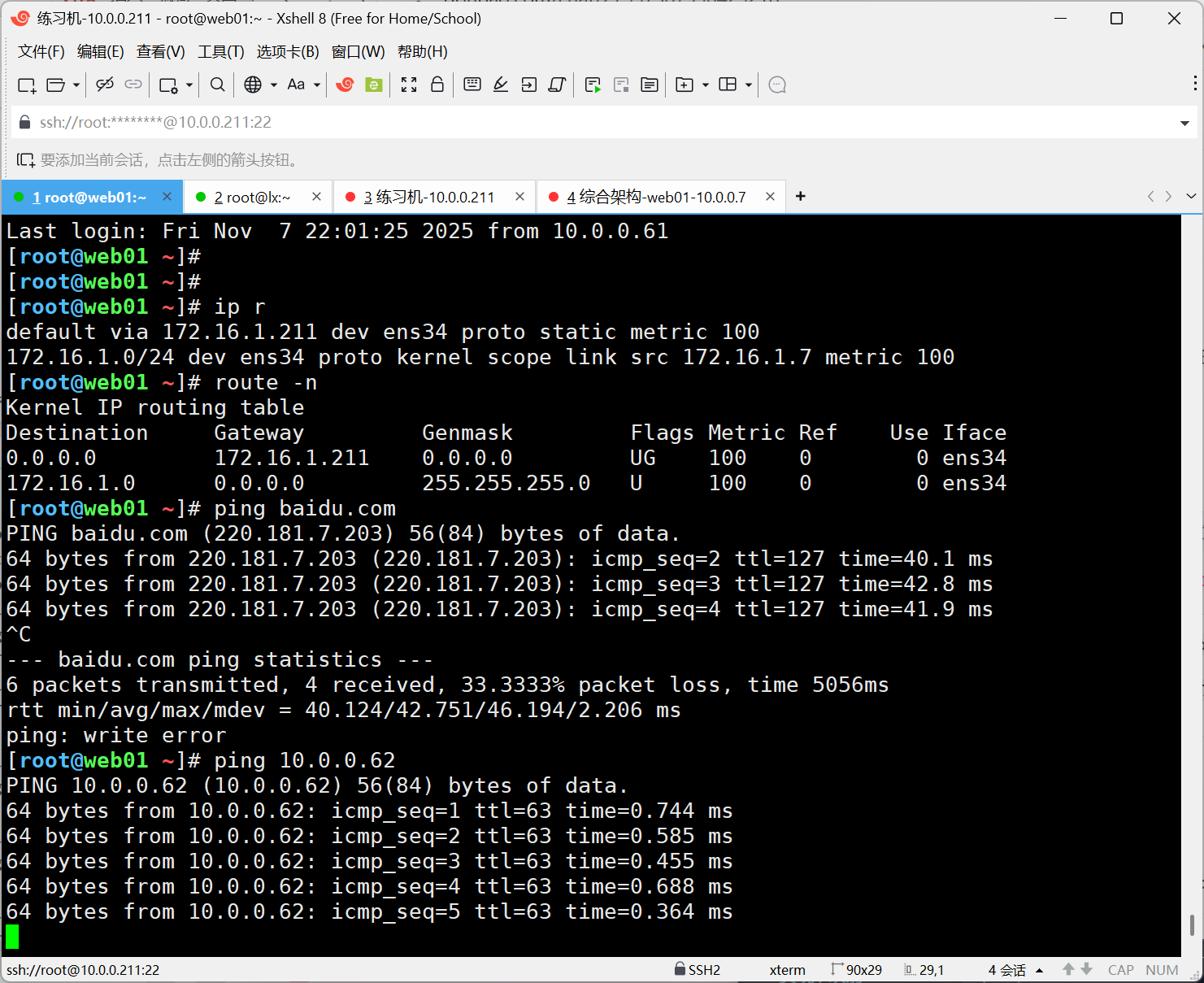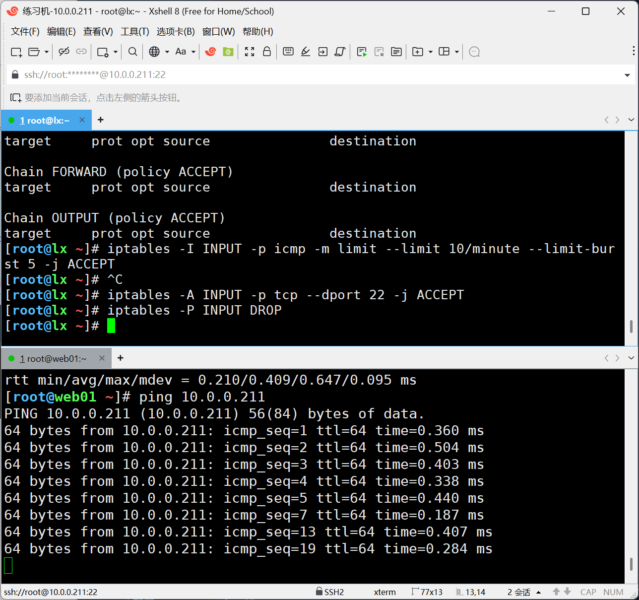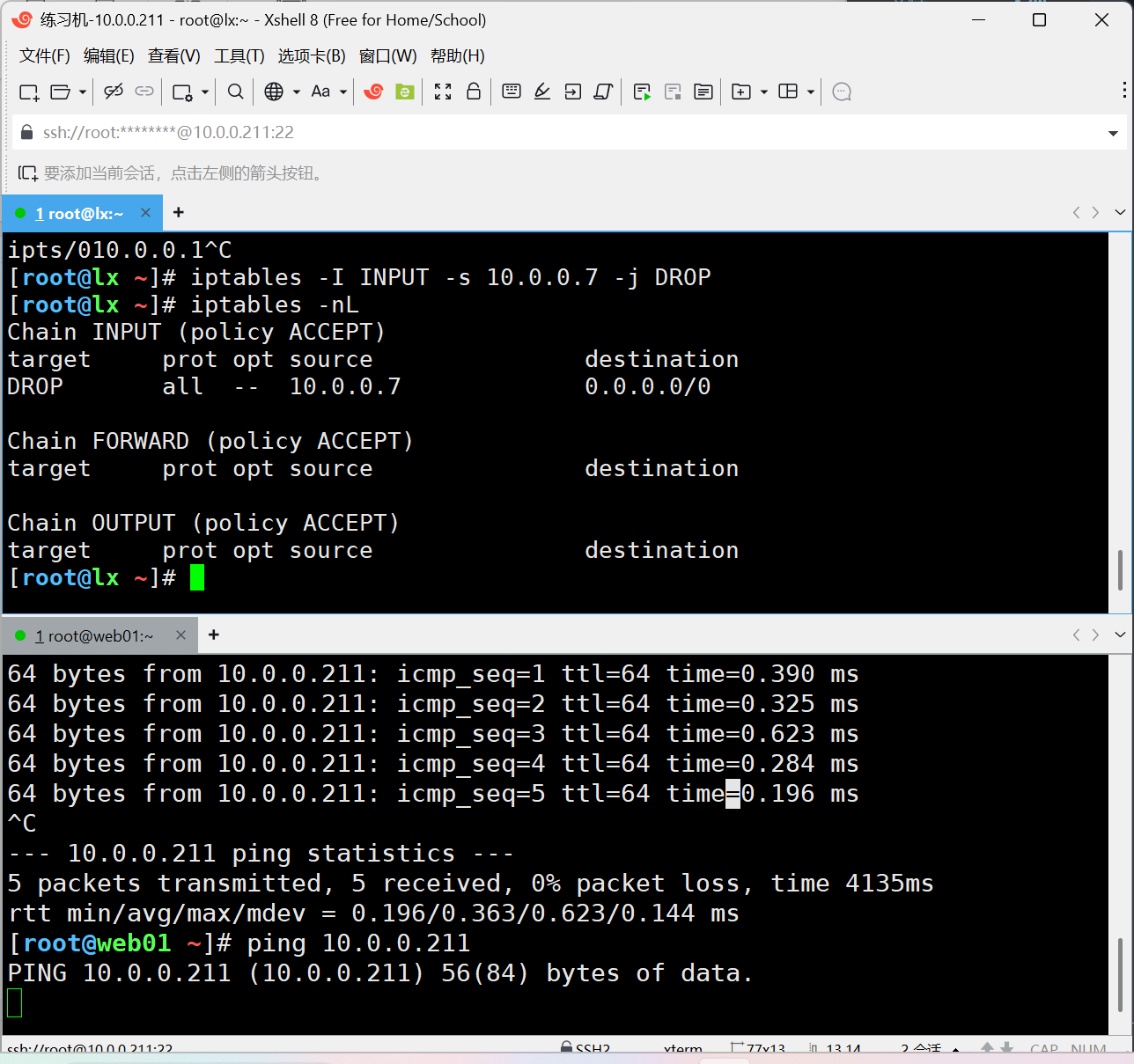 [root@lx ~]# iptables -t nat -A PREROUTING -d 10.0.0.211 -p tcp --dport 9999 -j DNAT --to-destination 172.16.1.7:22