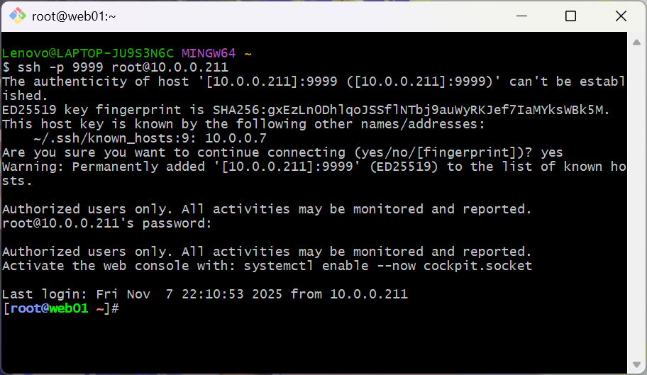 git-bash 测试 ssh -p 9999 root@10.0.0.61