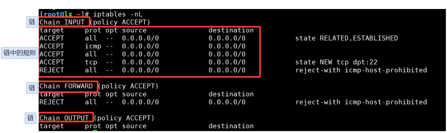 | 链(chain) | 是规则的容器,是一组规则的有序集合,数据包会按链的顺序依次匹配规则 |
