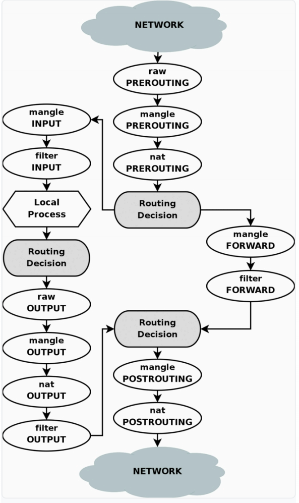 | nat | 负责网络地址转换,即来源与目的 IP 地址和 port 的转换。应用:和主机本身无关,一般用于局域网共享上网或者特殊的端口转换服务相关。工作场景:1. 用于企业路由(zebra)或网关(iptables),共享上网(POSTROUTING);2. 做内部外部 IP 地址一对一映射(dmz),硬件防火墙映射 IP 到内部服务器,ftp 服务(PREROUTING);3.WEB,单个端口的映射,直接映射 80 端口(PREROUTING)。这个表定义了 3 个链,nat 功能相当于网络的 acl 控制,和网络交换机 acl 类似。 |