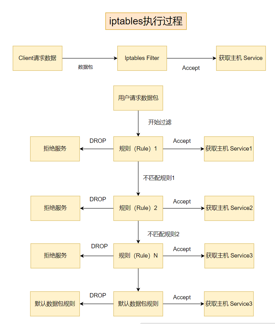 - 如果匹配成功规则,及明确表示是拒绝(DROP)还是接受(ACCEPT),数据包就不再向下匹配新的规则。