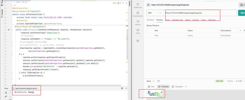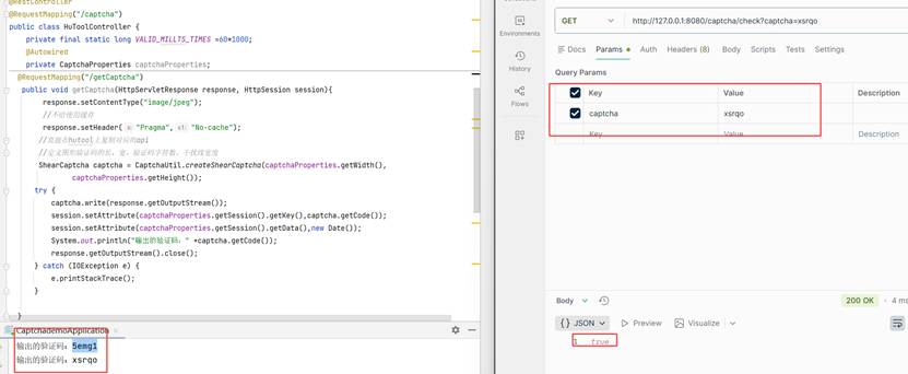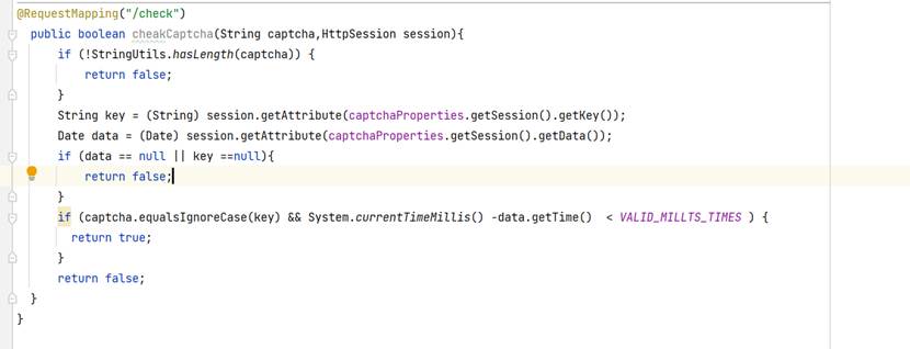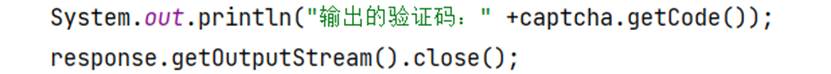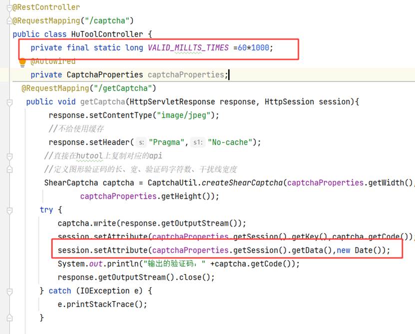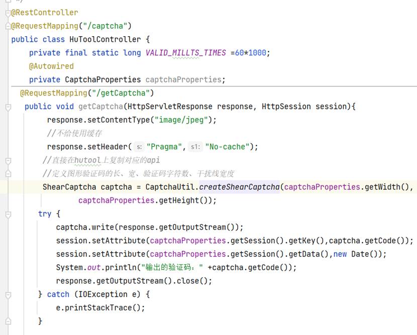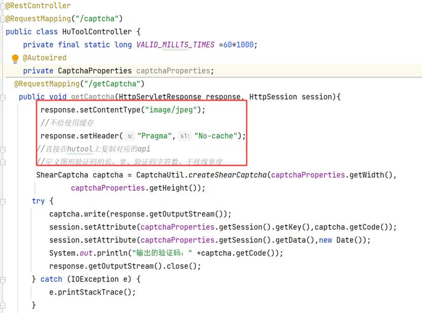 这段代码的核心主要就是先考虑到我们这个是给前端返回请求的,所以需要使用响应的格式,并且为了确保互不影响的情况需要使用session,接着指明传输的格式为图片类型,这样确保我们传输不会出现解析错误的问题,然后因为我们这个是验证码,所以不允许缓存(验证码缓存也没有用),之后就可以使用我们调用的HuTool工具了,创建验证码,接着需要把他返回到前端,然后session存储验证码和时间,接着关闭流对象