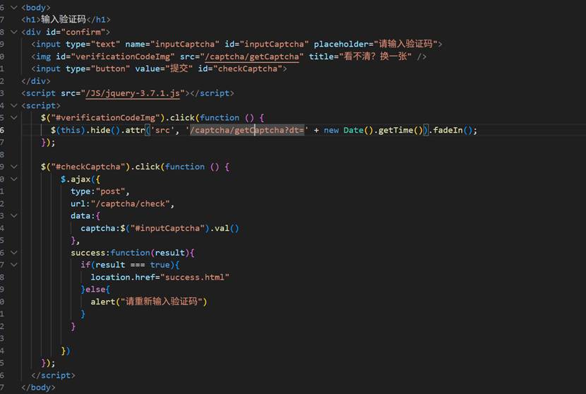 前端的代码很简答,只是在img的地方,把我们的验证码插入,当点击提交的时候,触发ajax,把输入往后端传输,如果成功就跳转,失败就弹窗提示,这里的核心是this那里,翻译成人话就是当点击图片的时候,就先把图片隐藏,然后马上向后端请求然后加一个?dt=加一个时间戳,这样虽然请求的url没变慢但是加时间戳,就会导致url每次都在变刷新url就会从新发送不会存在缓存的问题,后端甚至都不会读取这个数据,这个只是为了防止缓存存在的,拿到新的之后就逐渐显示,丝滑转场