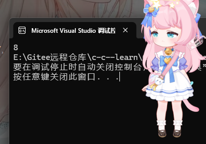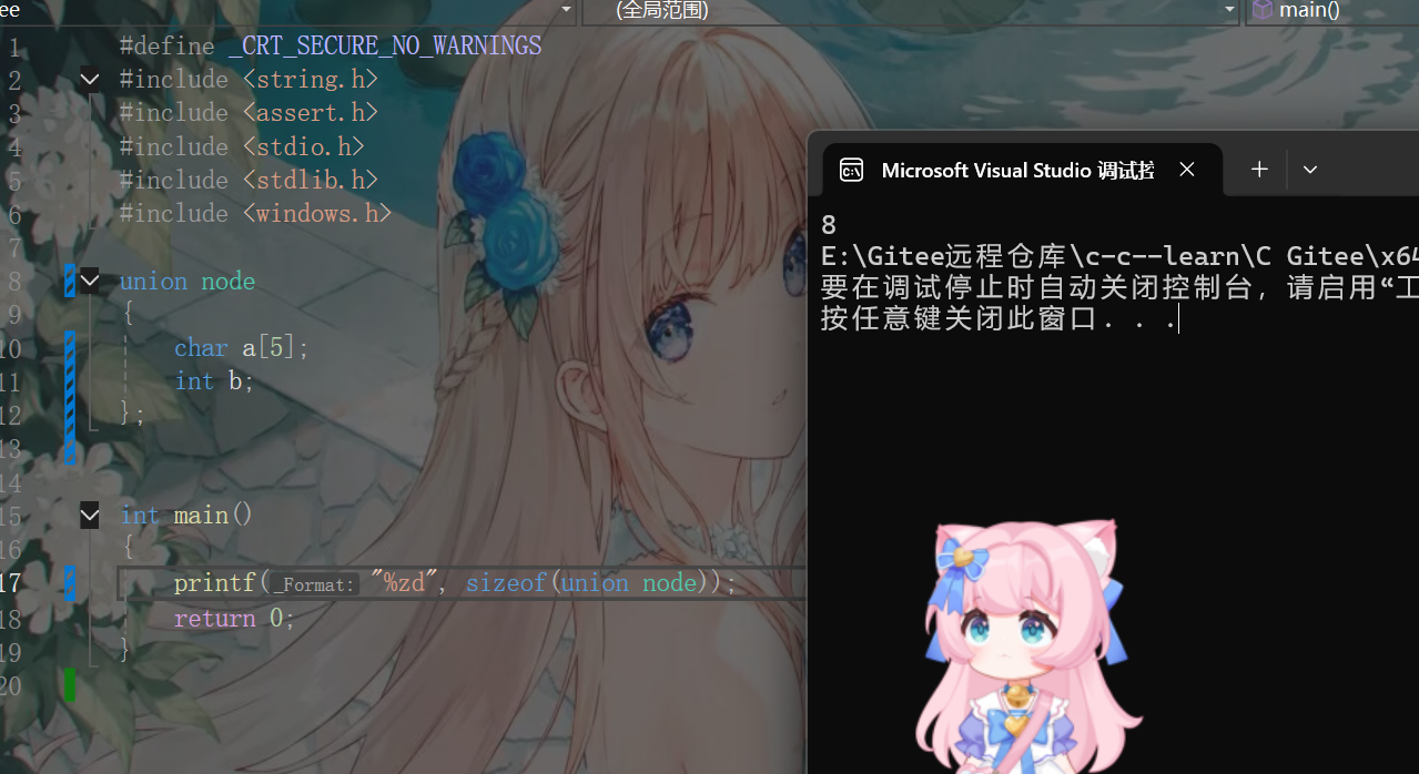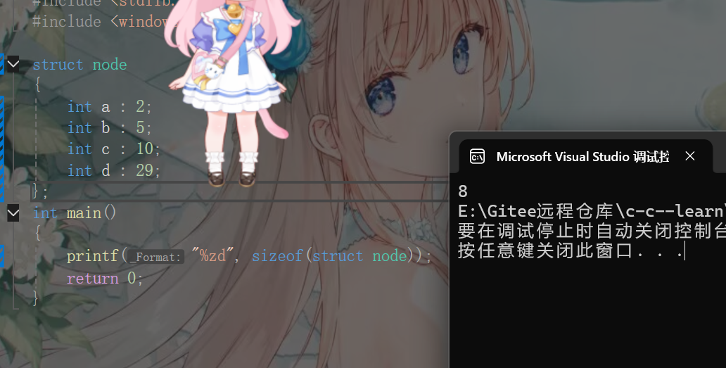 我们可以发现,开辟的内存是8个字节,相比先前的结构体而言少了4个字节,这可是整整少了三分之一,对于成员很多的结构体而言便是大优化了,那么,我们来看一下运行的结果是不是8呢,如下图