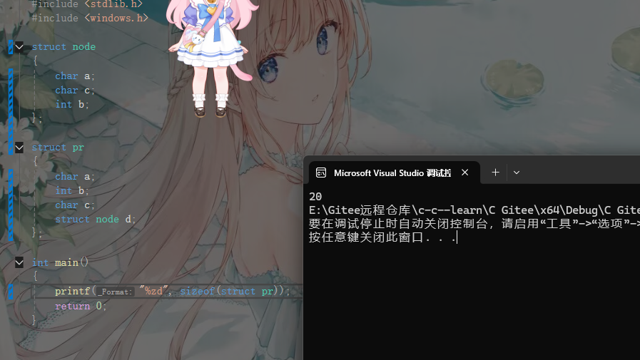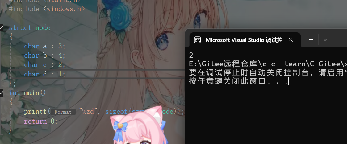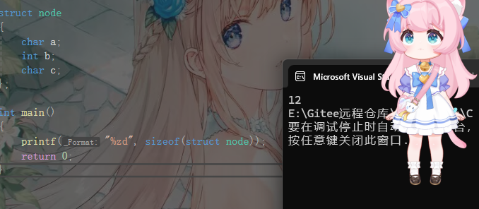 这个代码会输出什么呢,按照我们先前所学的只是来推理的话,char占一个字节,int占四个字节,这个结构体开了2个char类型以及1个int类型,那么就是2+4=6个字节,应该会输出6,那我们来运行一下看下会输出什么,如下图
