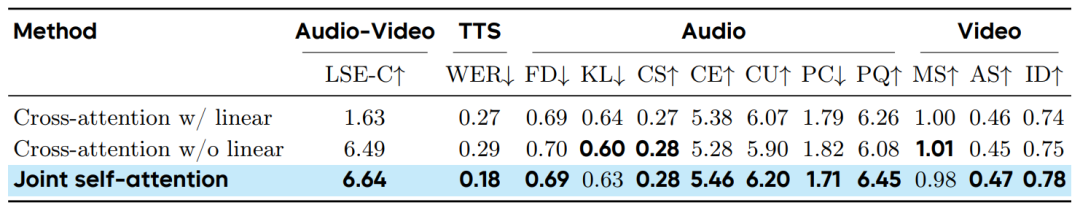 - 对比结果显示,联合自注意力(Joint Self-Attention) 机制在唇形同步(LSE-C 6.64)和语音准确性(WER 0.18)上均优于交叉注意力变体。