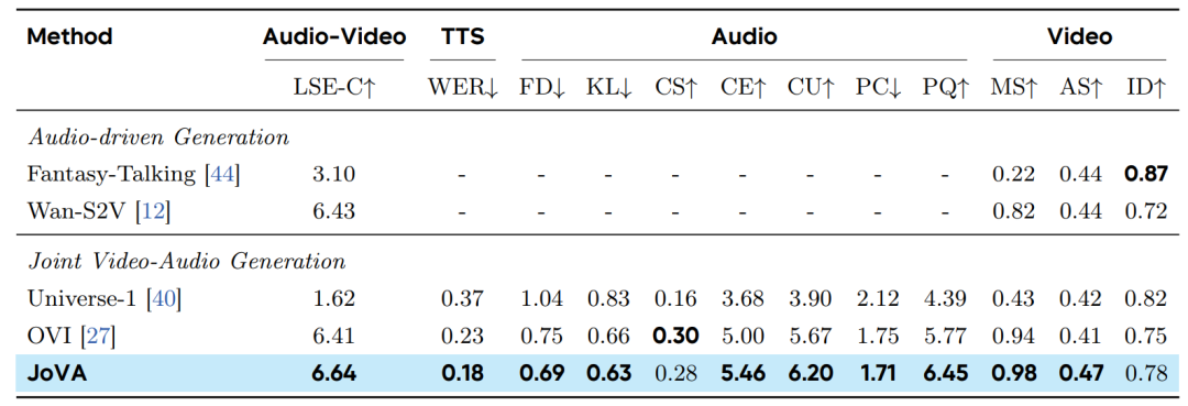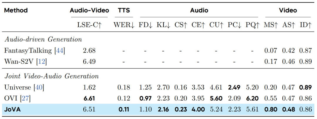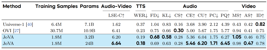 - 语音与音频质量:在文本转语音准确性上,JoVA 取得了最低的词错误率(WER 0.18);在音频生成指标(FD, KL, CE, CU, PQ)上均取得最佳分数。