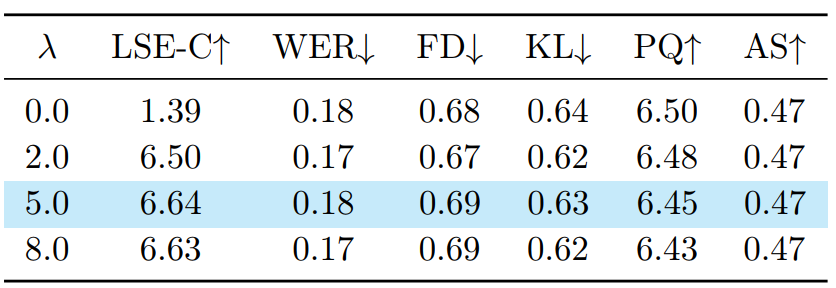 - 增加权重至 5.0 时,LSE-C 显著提升至 6.64,且未损害其他音频或视频质量指标。这表明针对嘴部区域的显式监督对于实现精确同步至关重要。