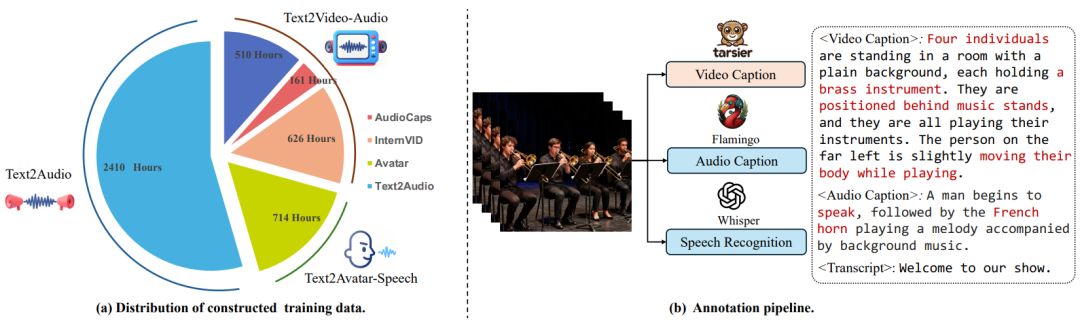 作者构建了包含三个部分的训练数据集:Text2Audio(环境音)、Text2Video-Audio(自然场景视听对)以及 Text2Avatar-Speech(数字人 / 说话人视频),总共约 1.9M 的训练样本。数据标注采用了一套自动化流水线:使用 Tarsier2 生成视频描述,Audio-flamingo3 生成音频描述,并利用 Whisper 进行自动语音识别(ASR)以获取语音文本。