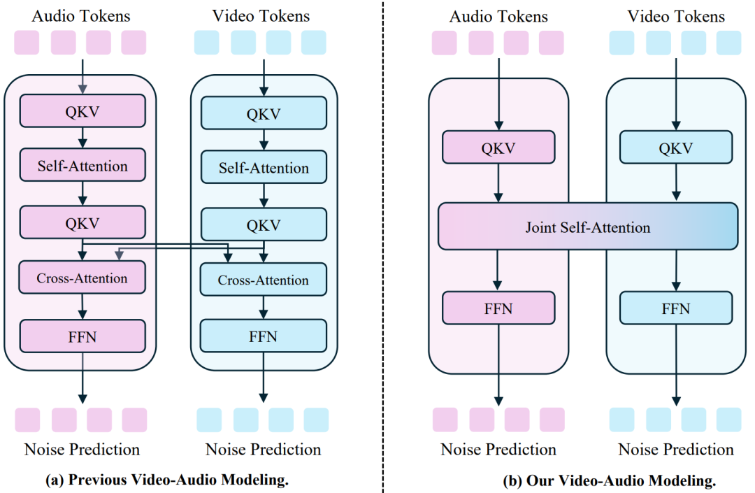 如下图 a, 现有的端到端方法(如 OVi 和 Universe 等),为了实现双模态对齐,需要在自注意力层 (self-attention) 之外,额外设计融合模块或跨注意力层 (Cross-attention)。这不仅破坏了 Transformer 架构的简洁性,还可能阻碍进一步的数据和模态扩展。