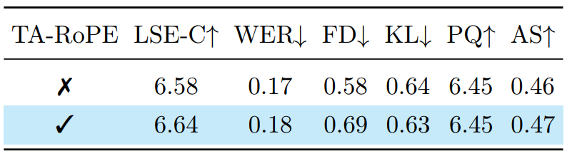 - 采用时间对齐的 RoPE(视频和音频共享时间维度的位置编码)相比未对齐版本,LSE-C 从 6.58 提升至 6.64。