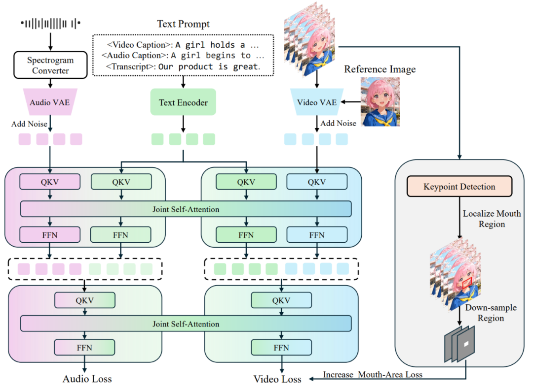 - 加权损失:在训练目标函数中引入了专门的嘴部损失项。该损失仅对视频潜特征中的嘴部掩码区域计算流匹配损失,并通过权重系数进行调节。最终的总损失函数由视频损失、音频损失和嘴部区域损失共同构成,从而在不增加推理阶段架构复杂度的前提下,强制模型学习细粒度的唇形 - 语音对齐。