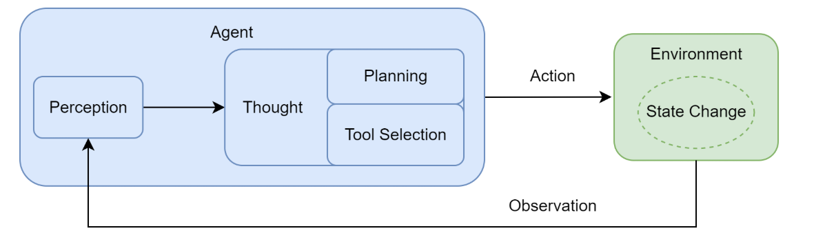 1.感知 (Perception):这是循环的起点。智能体通过其传感器(例如,API 的监听端口、用户输入接口)接收来自环境的输入信息。这些信息,即观察 (Observation),既可以是用户的初始指令,也可以是上一步行动所导致的环境状态变化反馈。