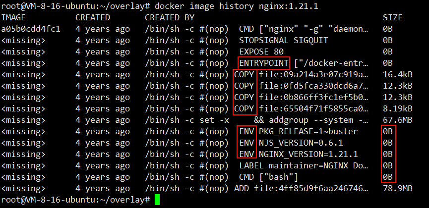 可以看到并不是所有层都占用大小,执行的语句都是Dockerfile文件的命令