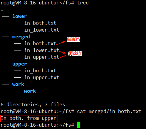是一个统一图层,从 mergedir 可以看到 lower,upper,workdir 中所有数据的整合,整 个容器展现出来的就是 mergedir 层.merged 层就是联合挂载层,也就是给用户暴露 的统一视觉,将 image 层和 container 层结合,就如最上边的图中描述一致,同一文 件,在此层会展示离它最近的层级里的文件内容,或者可以理解为,只要 container 层 中有此文件,便展示 container 层中的文件内容,若 container 层中没有,则展示 image 层中的。