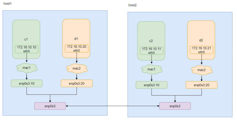 ipvlan 和 overlay 都可以实现不同主机上的容器之间的通讯,但是 ipvlan 是所有容器都 在一个网段,相当于在一个 vlan 里面,然后可以通过不同的子接口对应不同网段,实 现不同容器之间的通讯。而 overlay 可以实现不同网段之间的通讯。ipvlan 的 l2 网络 示例如下: