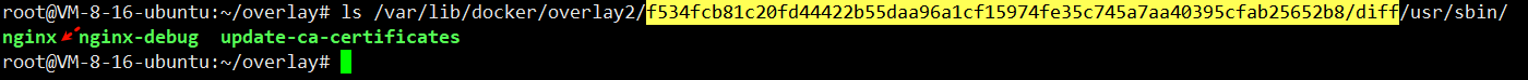 查看镜像层该目录文件,执行命令 ls /var/lib/docker/overlay2/f534fcb81c20fd44422b55daa96a1cf15974fe35c745a7aa40395cfab25652b8/diff/usr/sbin/