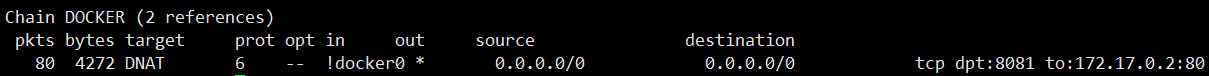 tcp dpt:8081 to:172.17.0.2:80 表示匹配 TCP 目的端口 8081 的流量,把它的 目的地址/端口 改成 172.17.0.2:80。