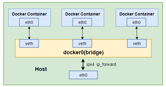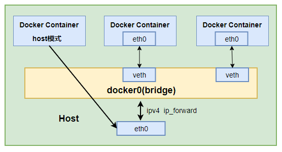 docker0 网桥开启了数据报转发功能(/proc/sys/net/ipv4/ip_forward),故将请求 发送至宿主机的 eth0 处;